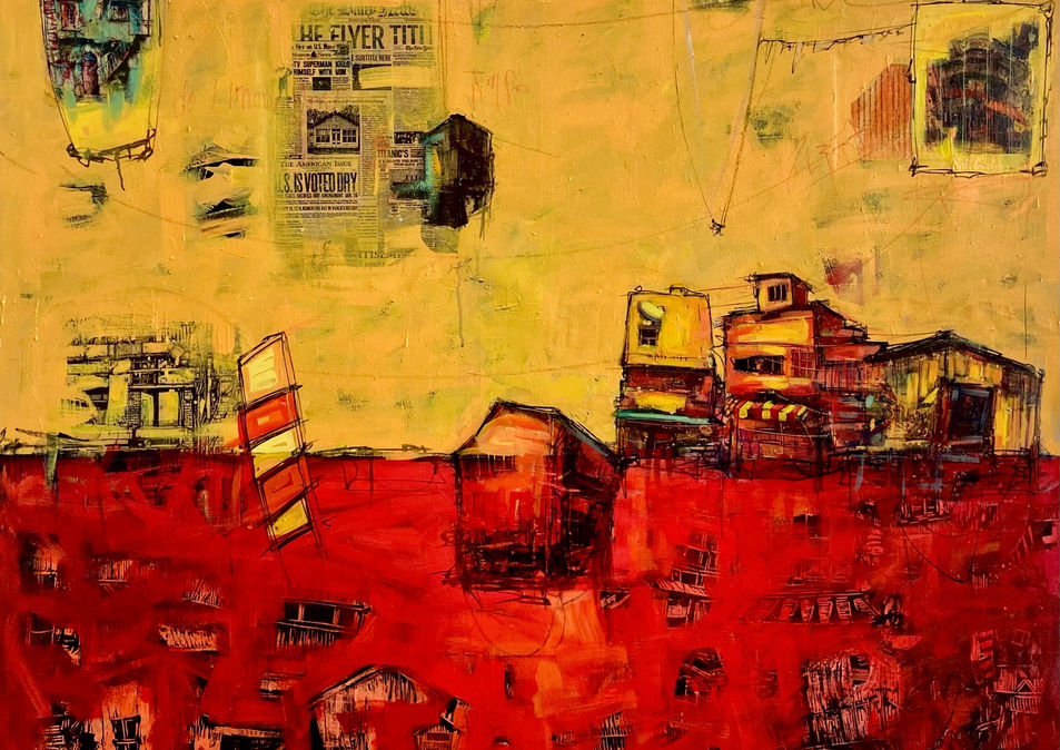 His work explores contrasts between differing ideas through the recurring subject of houses. By using this motif, Dawit seeks to highlight both the positive and negative aspects of life. As he explains, “Homes are a reflection of upbringing and identity, and they often mirror our personalities and attitudes.” Through layered imagery, he examines themes of identity, belonging, and displacement, inviting viewers to reconsider how they perceive space, self, and environment.