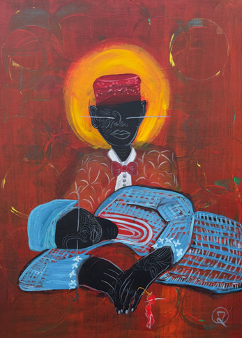 Esther Ketti Queen Phillips (b. 1999) known artistically as Jungel Queen—is a London-based visual artist working across painting, sculpture, textile, and digital media. Her multidisciplinary practice examines identity, sanctuary, and the reconstruction of safe spaces through an Afro-surrealist lens. Drawing from Yoruba and Oron traditions, Phillips creates immersive visual worlds shaped by the emotional landscape of migration, motherhood, and ancestral memory. Her material practice spans acrylic, fabric, clay, and 3D digital modelling, allowing her to merge the tactile intimacy of craft with the precision of contemporary technology. Central to her visual architecture is the red ground, a chromatic field symbolising protection, the maternal body, and the first site of belonging.